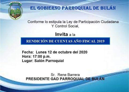 En cumplimiento al artículo 90 de la Ley de Participación Ciudadana y Control Social los integrantes el GAD Parroquial de Bulán se complacen en invitar a Ud. al evento de RENDICIÓN DE CUENTAS DEL AÑOS FISCAL 2019, el mismo que se llevará a cabo el día lunes 12 de octubre del 2020, en el salón parroquial a las 17h00.